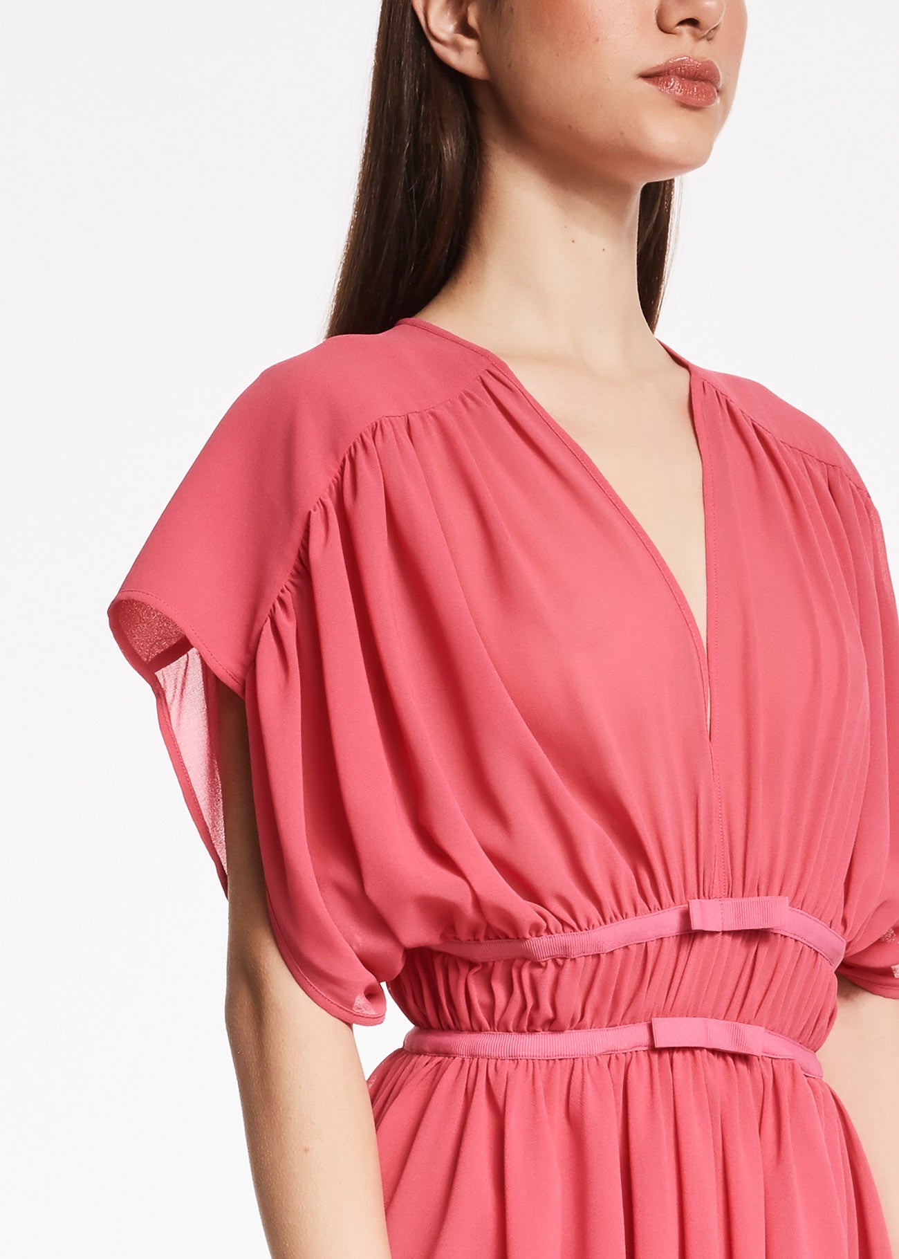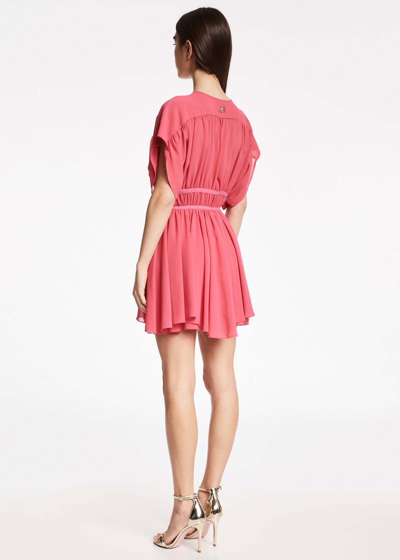 Abito corto in georgette. Il modello ha scollo a V, maniche a kimono e gonna a pieghe. L'inserto elastico rifinito con fiocchetto valorizza la silhouette.