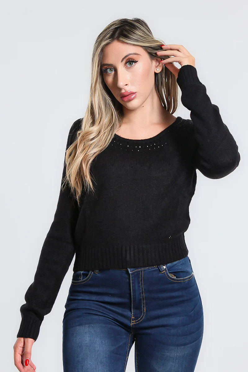 Maglione a manica lunga con collo arrotondato. Dettaglio applicazione strass sul davanti.