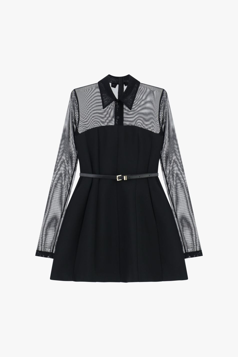 Dettaglio distintivo per questo abito corto con maniche lunghe trasparenti e classico colletto a punta. La chiusura frontale con bottoni e la cintura sottile in vita valorizzano la silhouette, mentre la linea essenziale lo rende ideale per chi ricerca opzioni versatili e dall'estetica contemporanea.