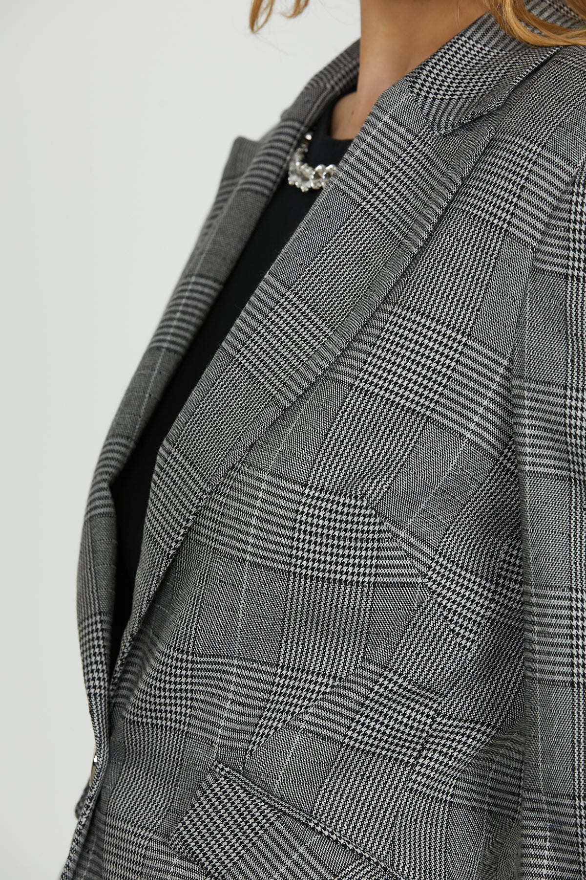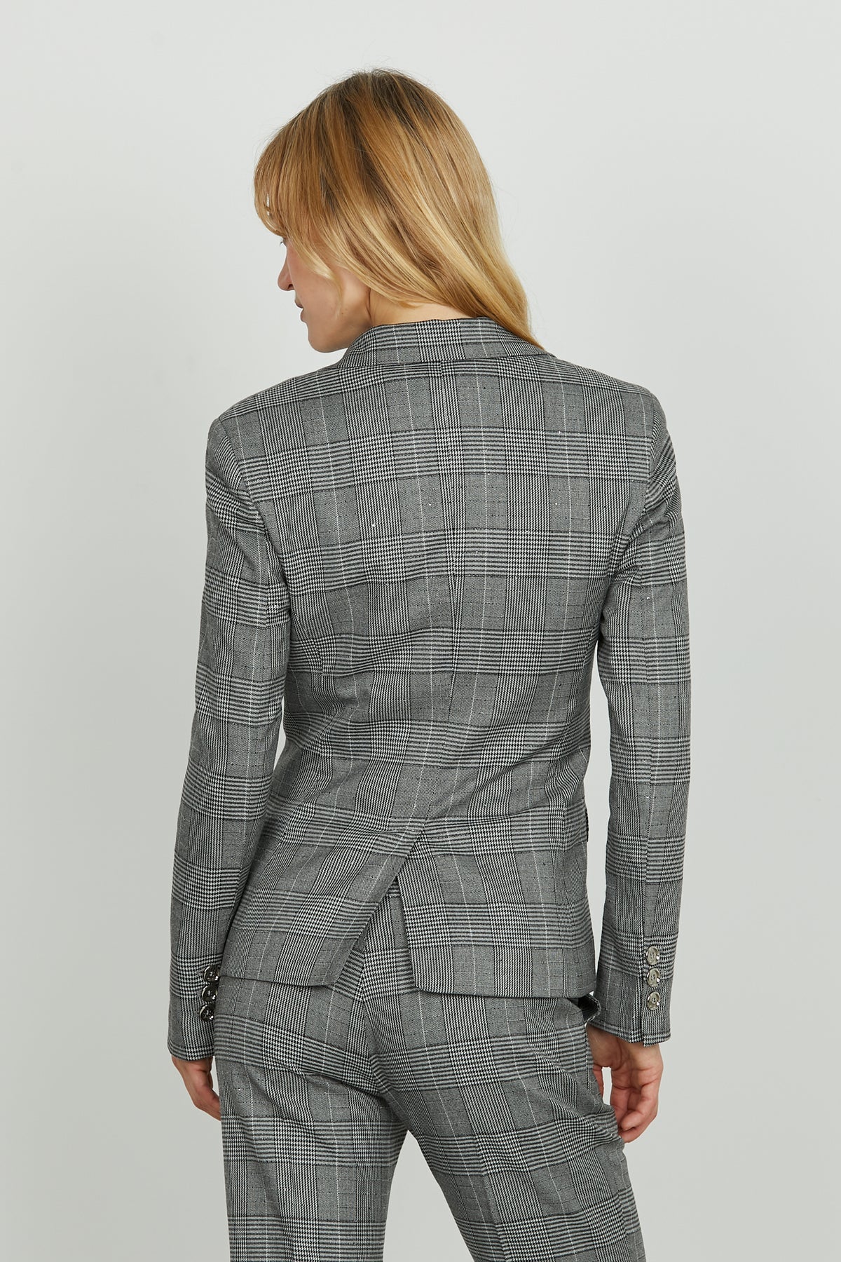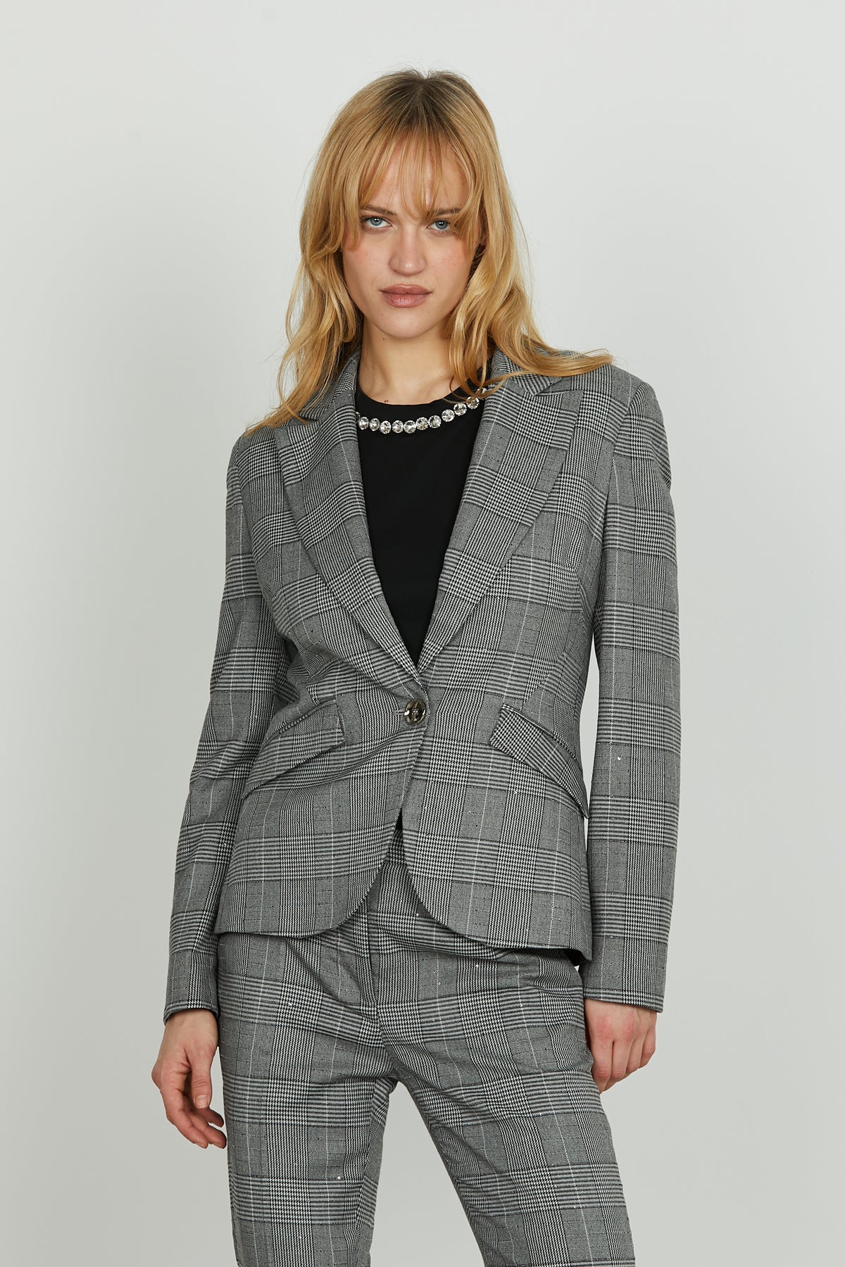 La fantasia micro quadri incontra la luminosità delle paillettes in questa giacca dal taglio moderno e silhouette slanciata. Chiusura a un bottone, tasche oblique e dettagli ricercati rendono il modello SKIL_QU un mix perfetto di eleganza e originalità. Ideale per chi ama distinguersi con stile.