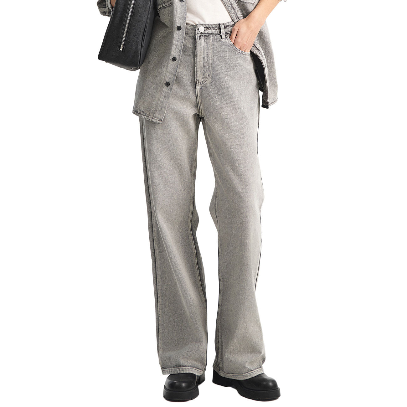 Questi jeans di Eleh definiscono un'estetica effortlessly chic con la loro silhouette wide-leg di ispirazione vintage. Il denim grigio chiaro, dall'effetto slavato e vissuto, offre una sfumatura sofisticata. La vestibilità a vita alta e le cuciture che incorniciano la gamba conferiscono struttura e un tocco di sartorialità. Un capo versatile che bilancia la disinvoltura del casual con la ricercatezza del design contemporaneo. L'essenza del cool urbano e minimalista.