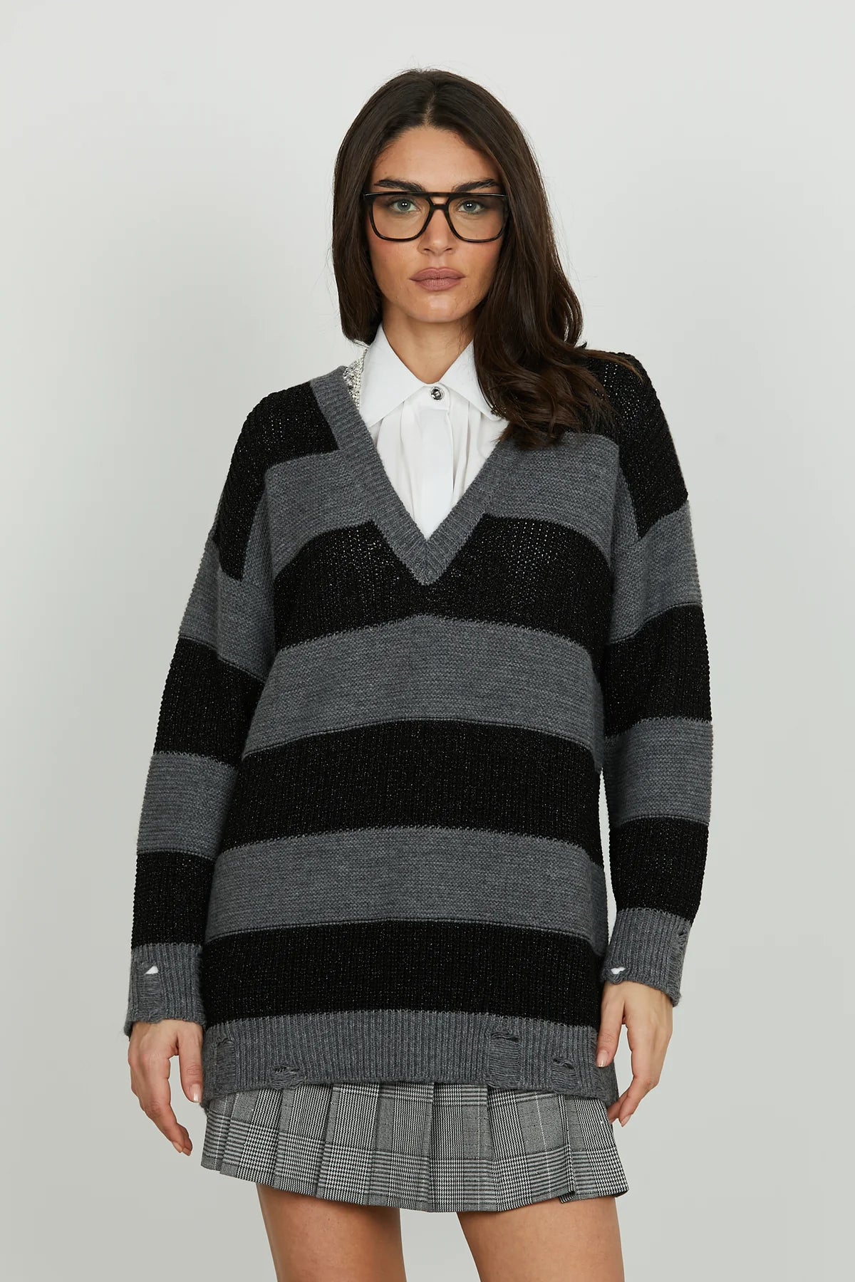 Lunga, morbida e dallo scollo a V profondo, la maglia Artemis gioca con righe luminose in lurex e rotture strategiche per un effetto lived-in ultra cool. Perfetta per look metropolitani che mixano grinta e femminilità con stile disinvolto.