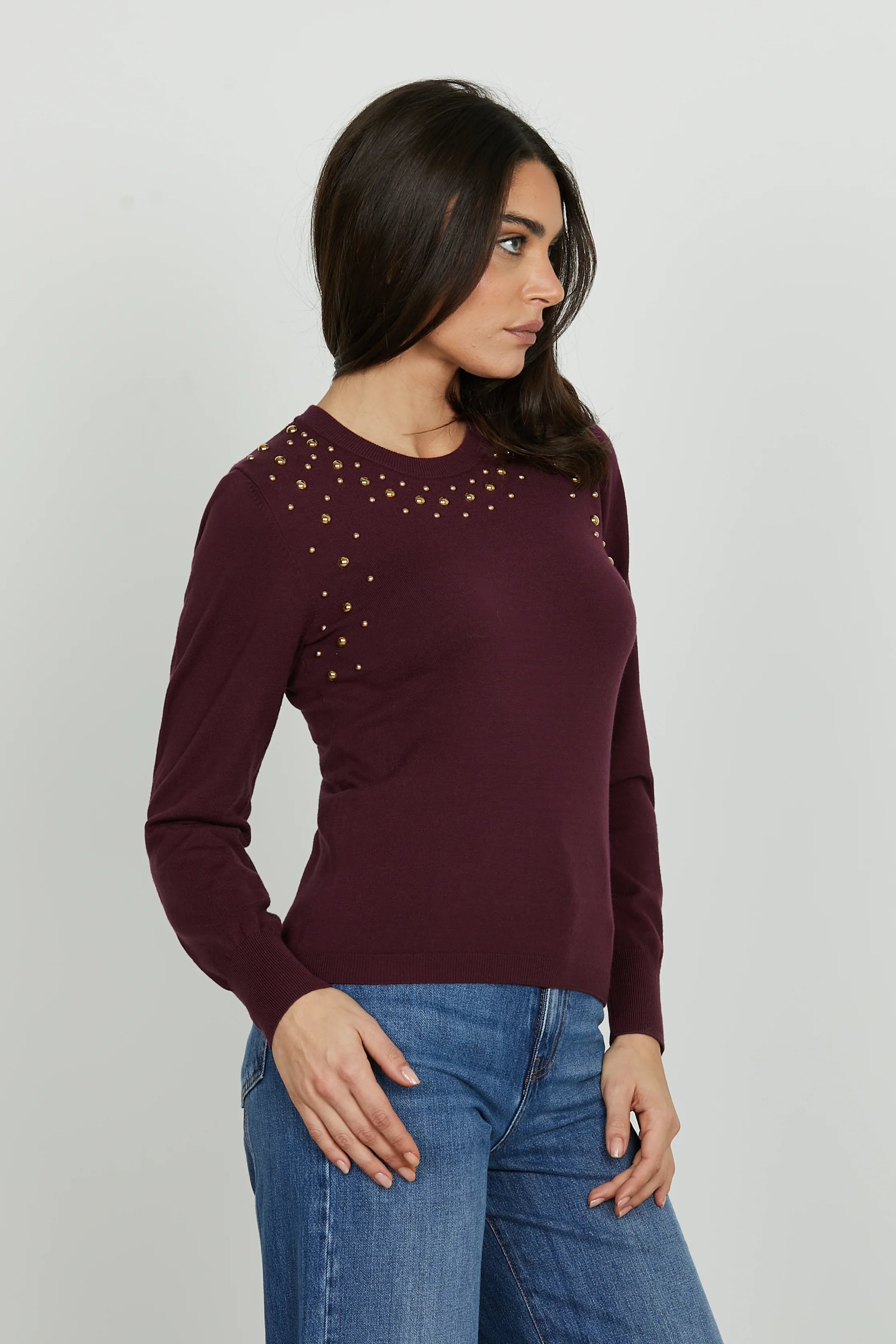 La maglia ELIAS unisce linee pulite a un dettaglio deciso: le borchie applicate donano un tocco rock-chic a un capo essenziale, perfetto per look urban e casual con carattere.