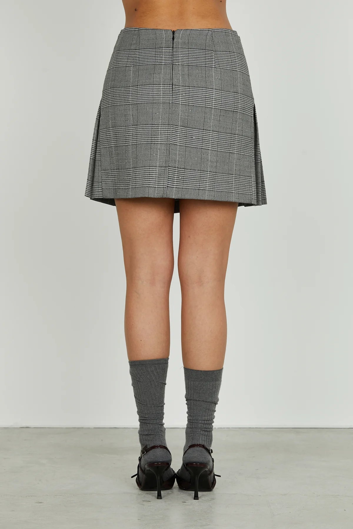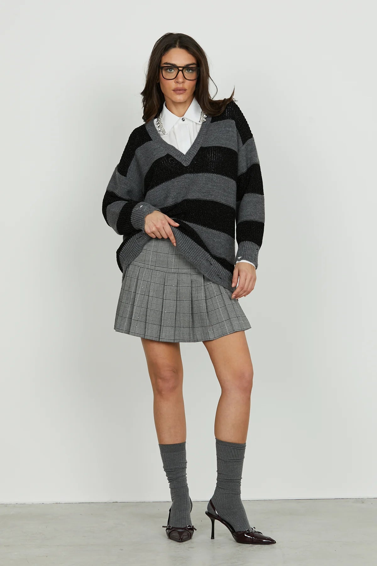 Corta e sbarazzina, la gonna Zaira_Qu reinventa lo stile a pieghe con una fantasia micro quadri e un tocco sparkling di paillettes. Un mix perfetto tra ispirazione preppy e dettagli glam, per un look giovane e irresistibile.