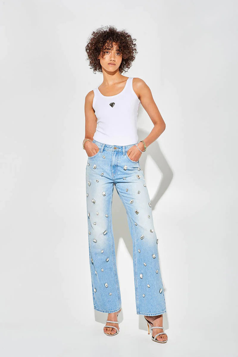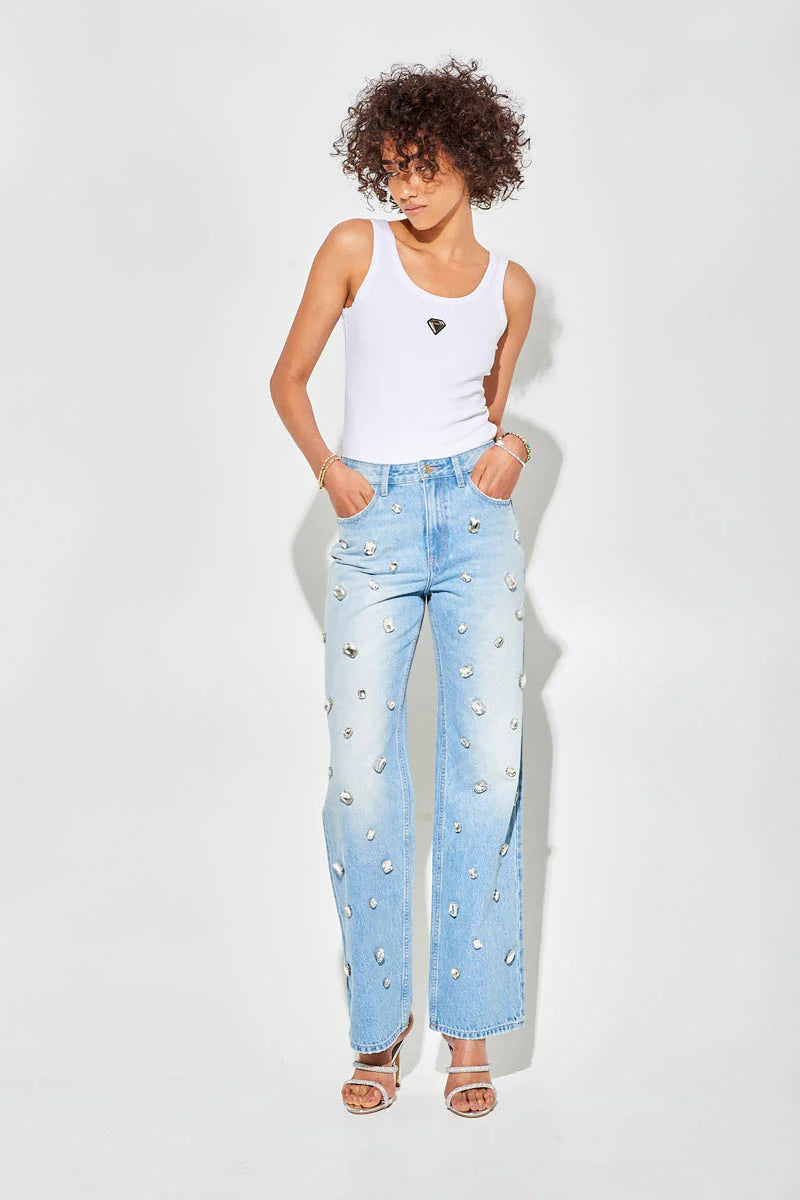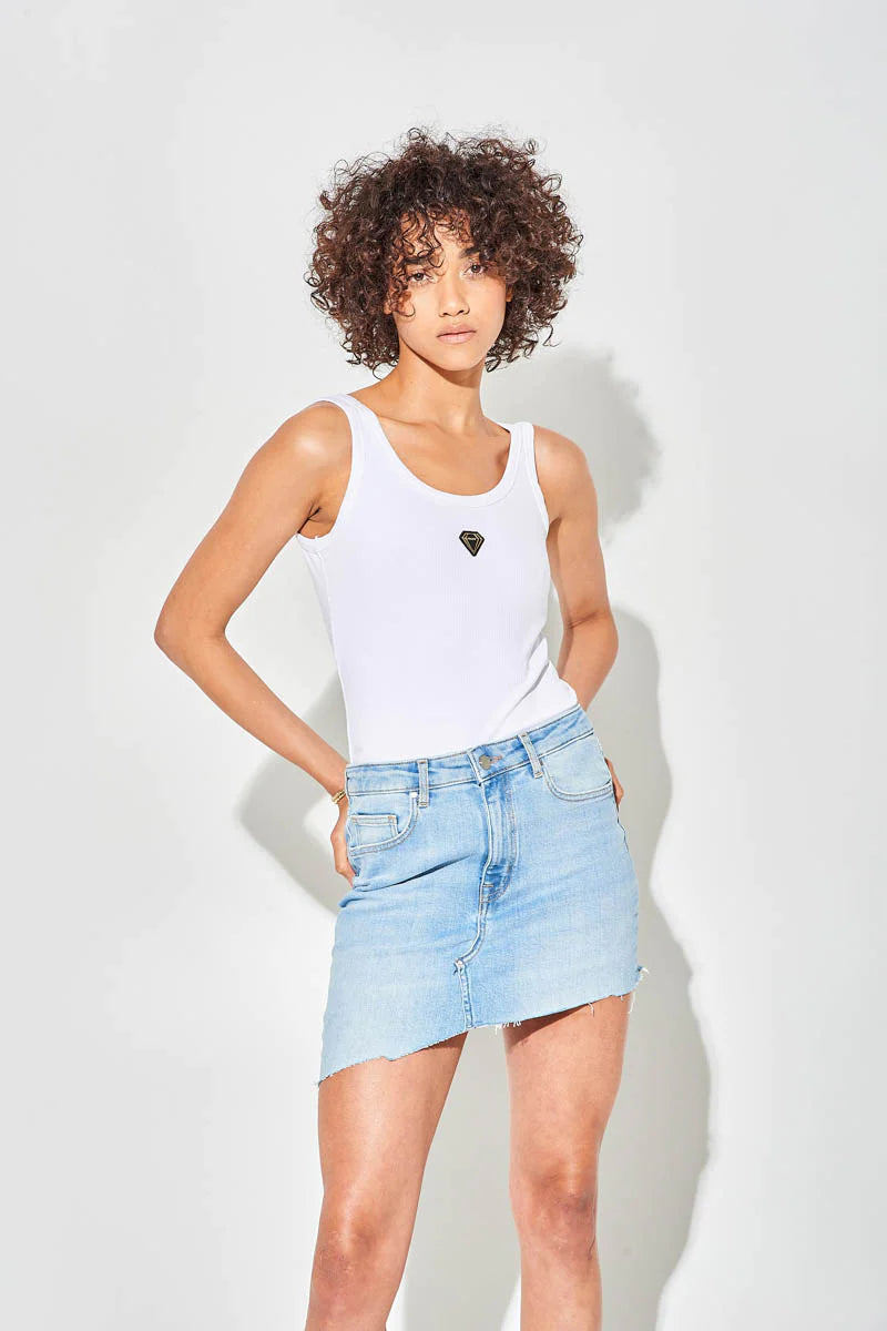 TOP CANOTTIERA CON COLLO ARROTONDATO. DETTAGLIO PATCH MET SUL DAVANTI