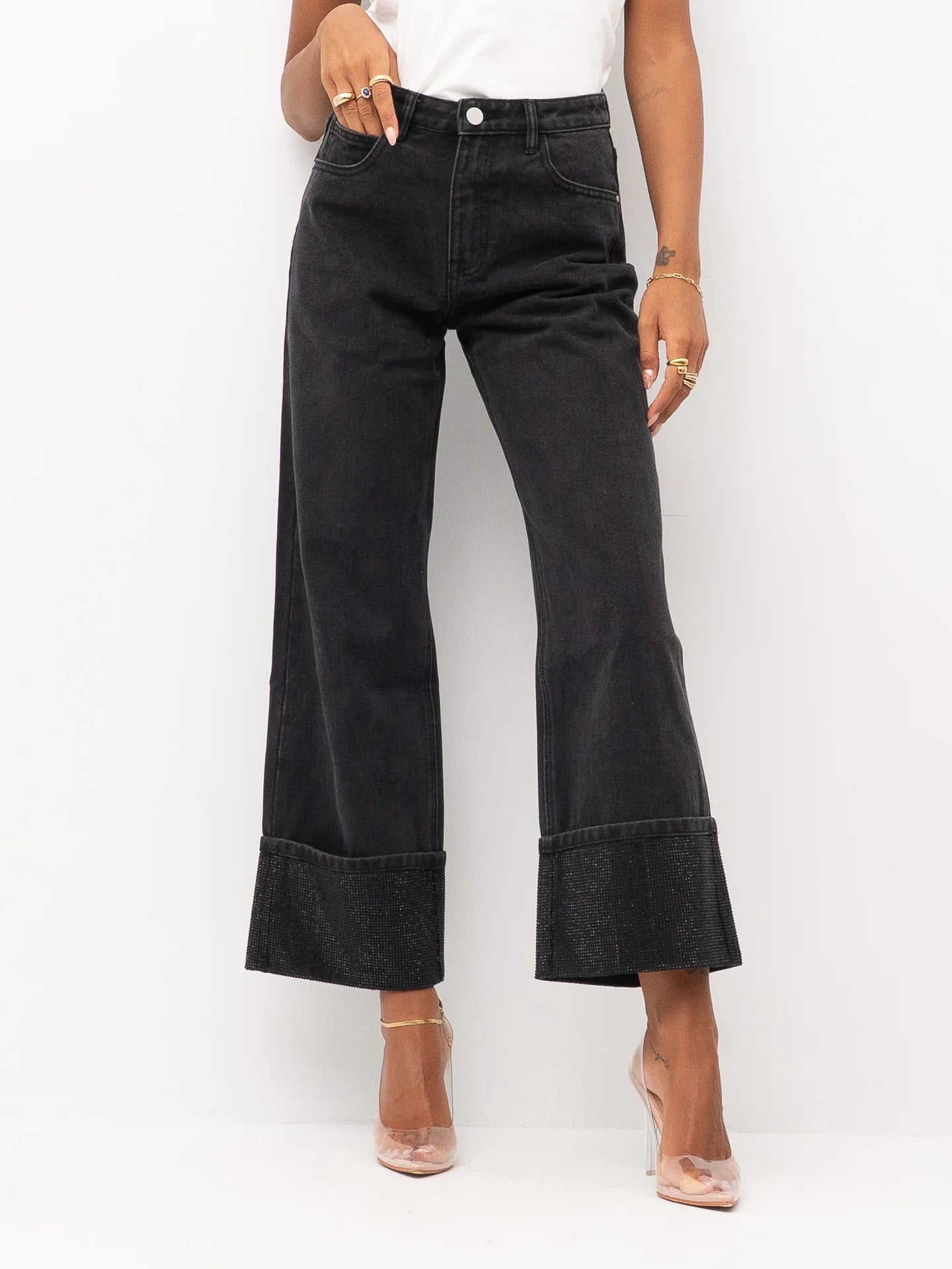 Dettagli: risvolto applicato sul fondo con microstrass tono su tono, cinque tasche, cuciture in tinta