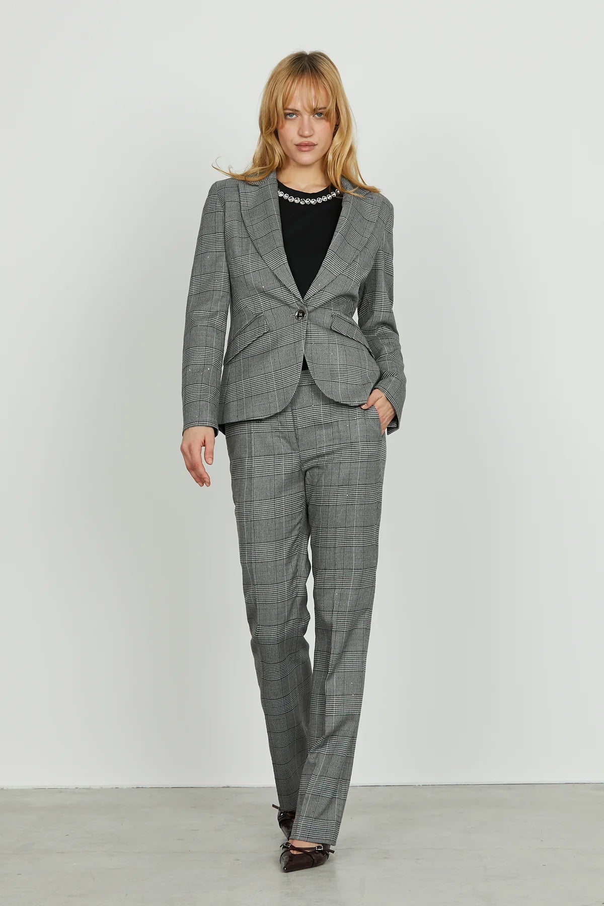 Con la sua linea a zampetta e la vita alta che slancia la figura, il pantalone CLOES_QU unisce la raffinatezza della fantasia micro quadri alla brillantezza discreta delle paillettes. Le tasche francesi aggiungono un tocco classico, mentre il dettaglio scintillante rende questo capo perfetto per chi vuole brillare con stile.