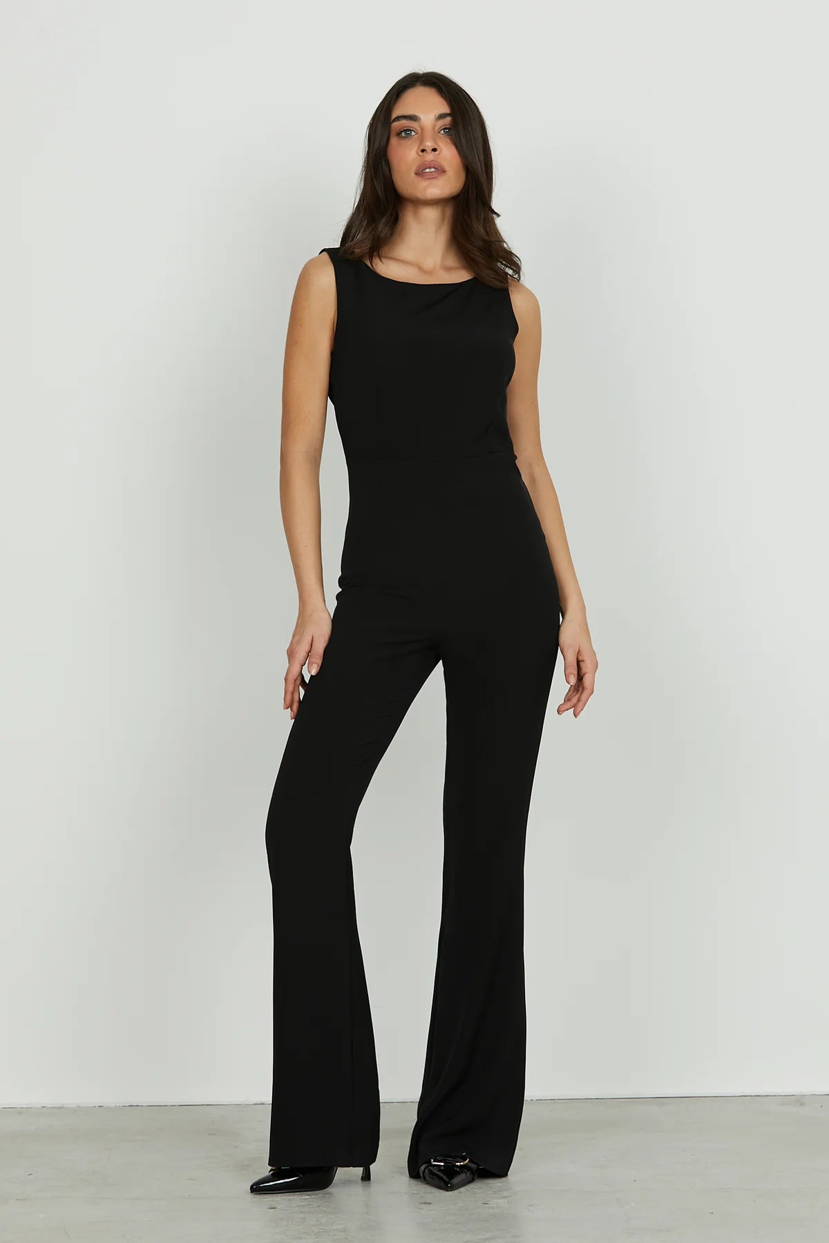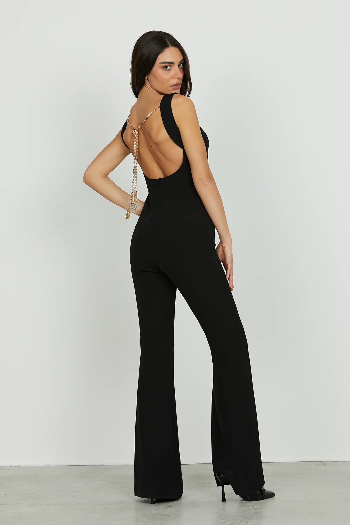 La Tuta ALIQUA senza maniche sorprende con la sua linea pulita e moderna. L’apertura sulla schiena dona un tocco di sensualità discreta impreziosita dalla collana integrata con placca logo che dona eleganza e personalità. Perfetta per chi cerca un outfit sofisticato e di carattere, ideale per occasioni speciali o serate glamour.