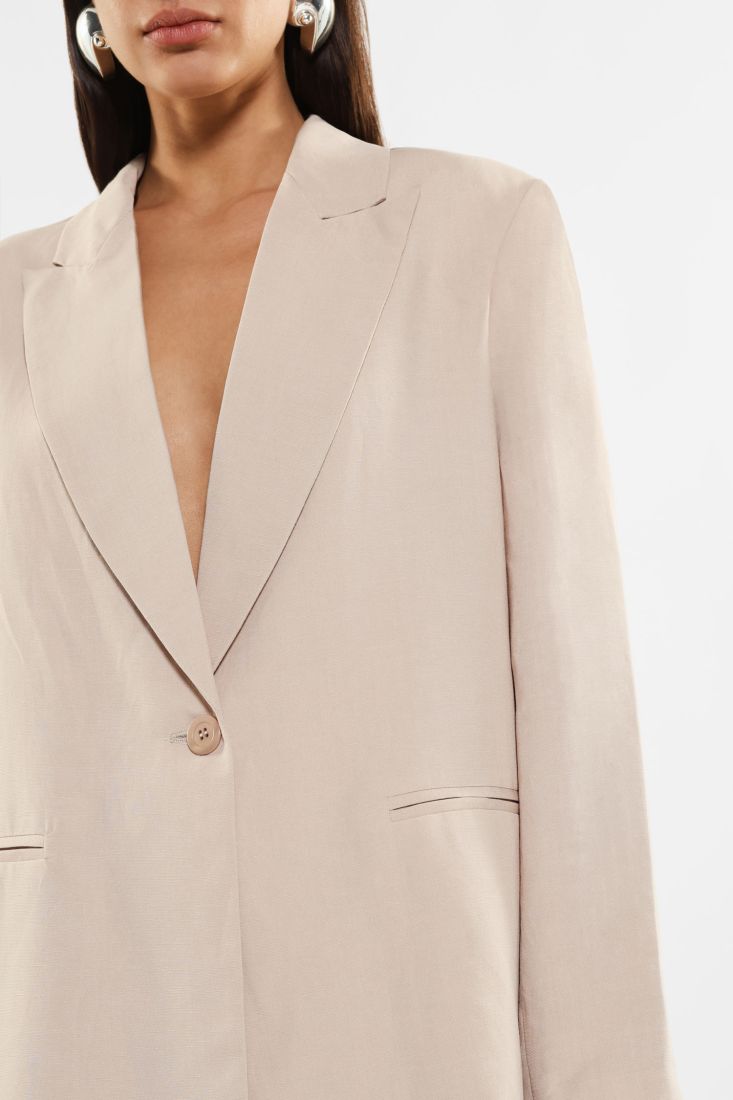La giacca monopetto è caratterizzata da rever a lancia, bottone singolo tono su tono e taschini a filetto.