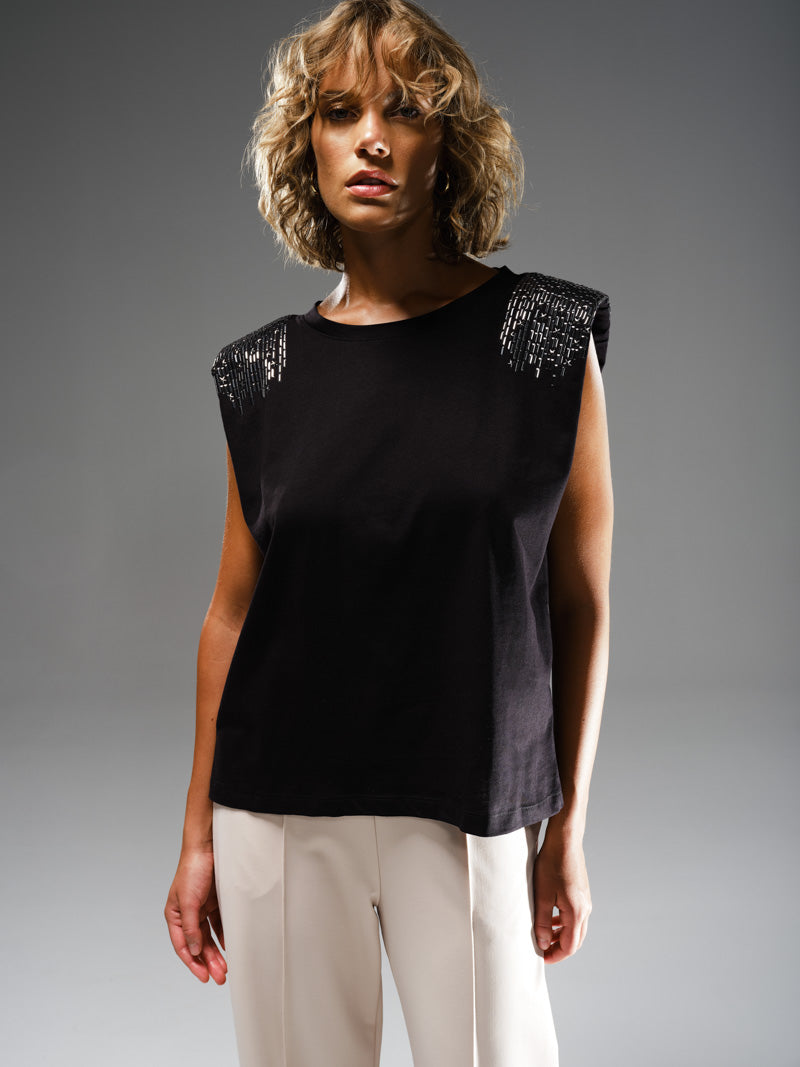T-shirt con spalline e applicazioni