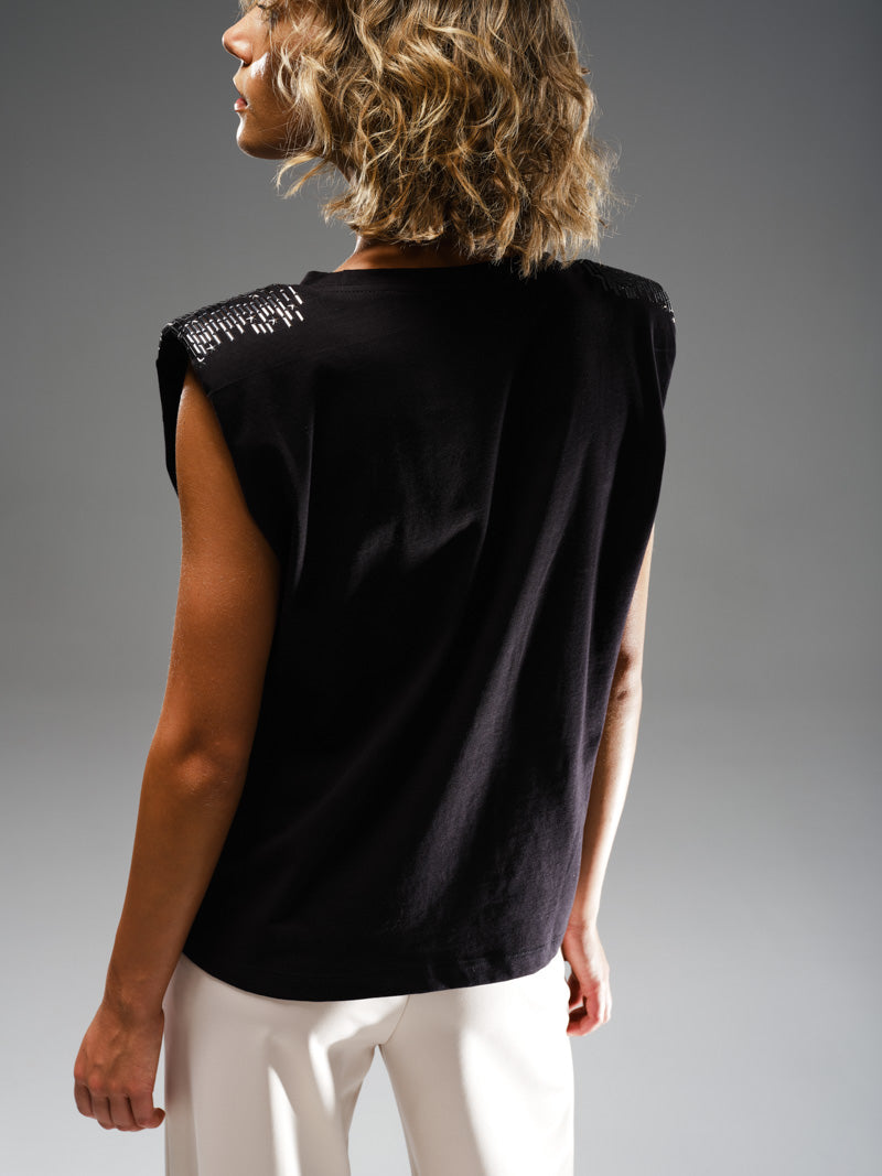 T-shirt con spalline imbottite e applicazioni termoadesive.